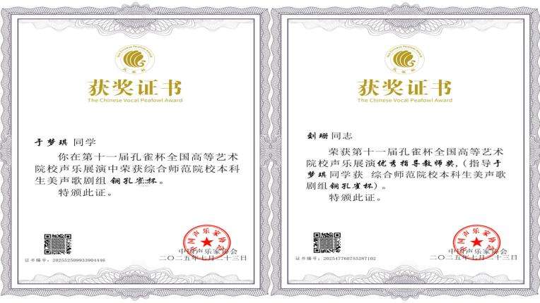 2021级歌剧表演本科班于玲玉(指导教师:付茜)荣获综合师范院校本科生美声歌剧组铜孔雀杯,歌剧系副教授付茜荣获优秀指导教师奖。